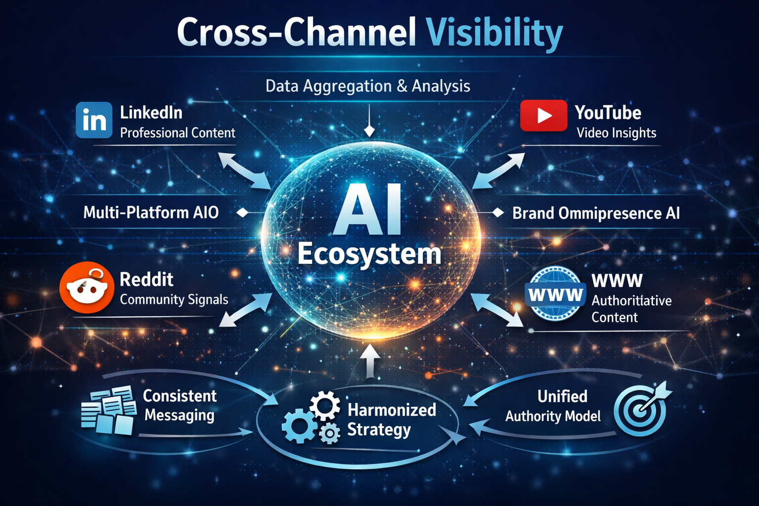 Cross-channel AI visibility is about training AI systems to recognize, trust and recommend your brand consistently across platforms. Instead of ranking on one channel, the goal is synchronized authority where LinkedIn posts, YouTube videos, Reddit discussions and web content reinforce a single, unified brand narrative that AI models confidently surface everywhere.